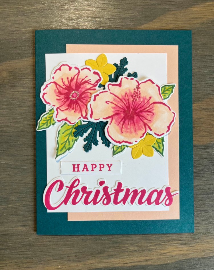 This card is a tropical twist on a Christmas card. It was cased from a card published in Stampin Succeed publication that showcased how to make holiday cards with non-holiday stamps. I also offered a “Happy Birthday” Sentiment to my campers who attended in case they preferred to make this a Birthday card instead. This card used blending markers to make the different shades in the leaves and flowers.