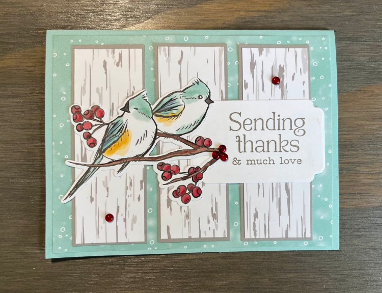 We all need beautiful thank you cards to express our thanks for the wonderful Christmas presents we receive. This card was cased from Amy Koenders’s design at Stampin With AmyK. These winter birds make the card special. We used Nest of Winter Designer Series Paper that have these gorgeous birds printed on them. We simply used the corresponding dies to cut out the bird. If one didn’t have the dies, they could also simple cut out by hand (called fussy-cutting) so this is a simple card to make that really only needs paper. The birch wood panel paper is also from the same paper set.