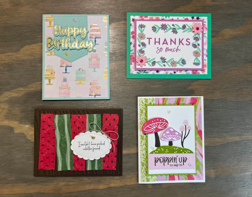 We made 4 cards- one was a Happy Birthday card, a Thank You card, a friendship card, and a hello card. 3 of the cards used items from Sale A Bration.