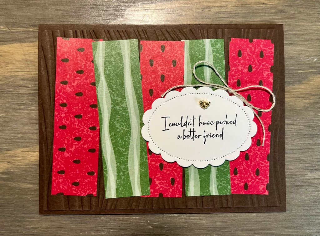 The first card we made is a Friendship card. The cute watermelon paper is from a Sale A Bration item, Fruit Salad Designer Series paper. This paper has all kinds of cute fruit designs. The sentiment is from the Lifelong Friends Stamp Set