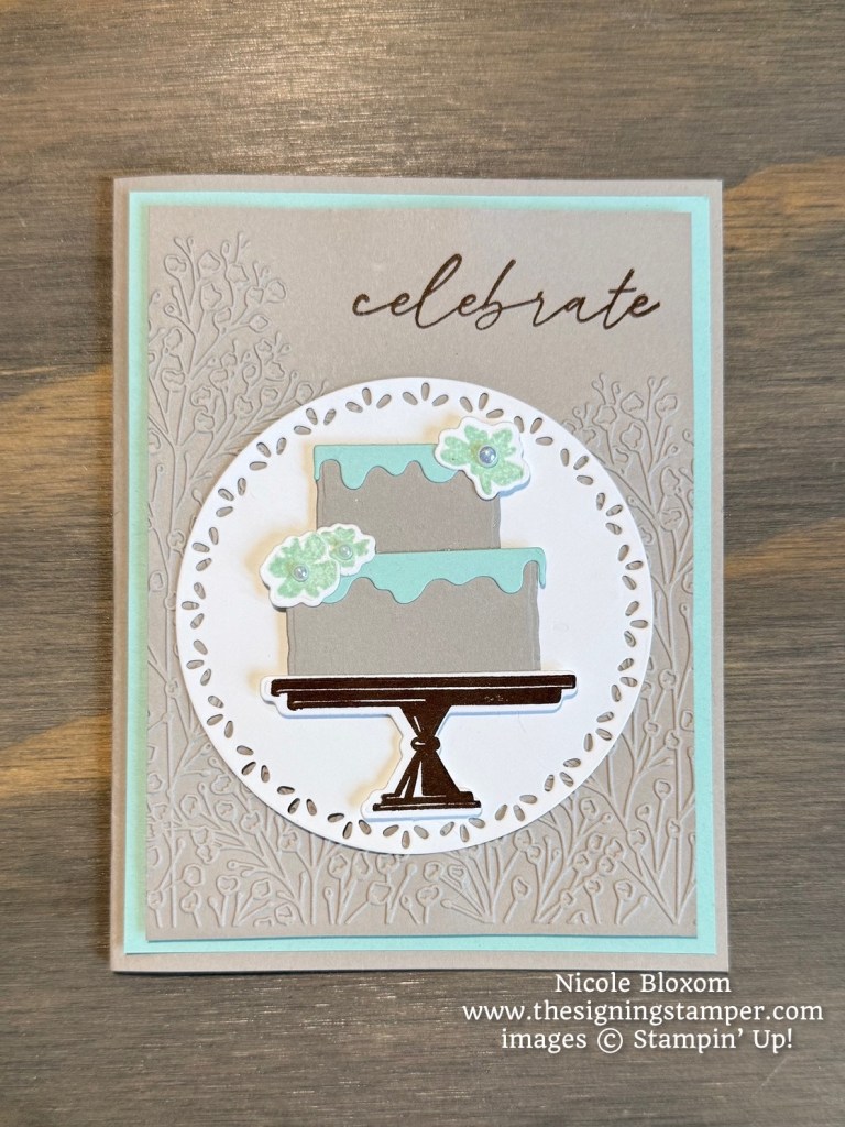 Today’s post features one of my favorite stamp bundles that is now on the Last Chance list. Scoop this one up before it is gone! This card is great for birthdays and also weddings or anniversaries as well! You can stamp the cake, die cut the cake or both. There are several stamp and dies for embellishing the cake too!