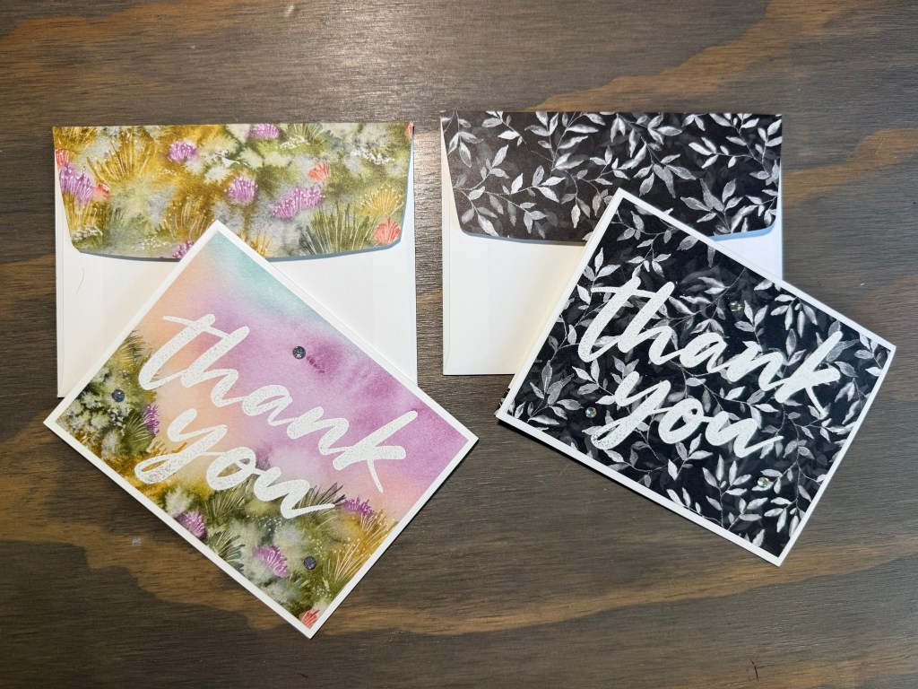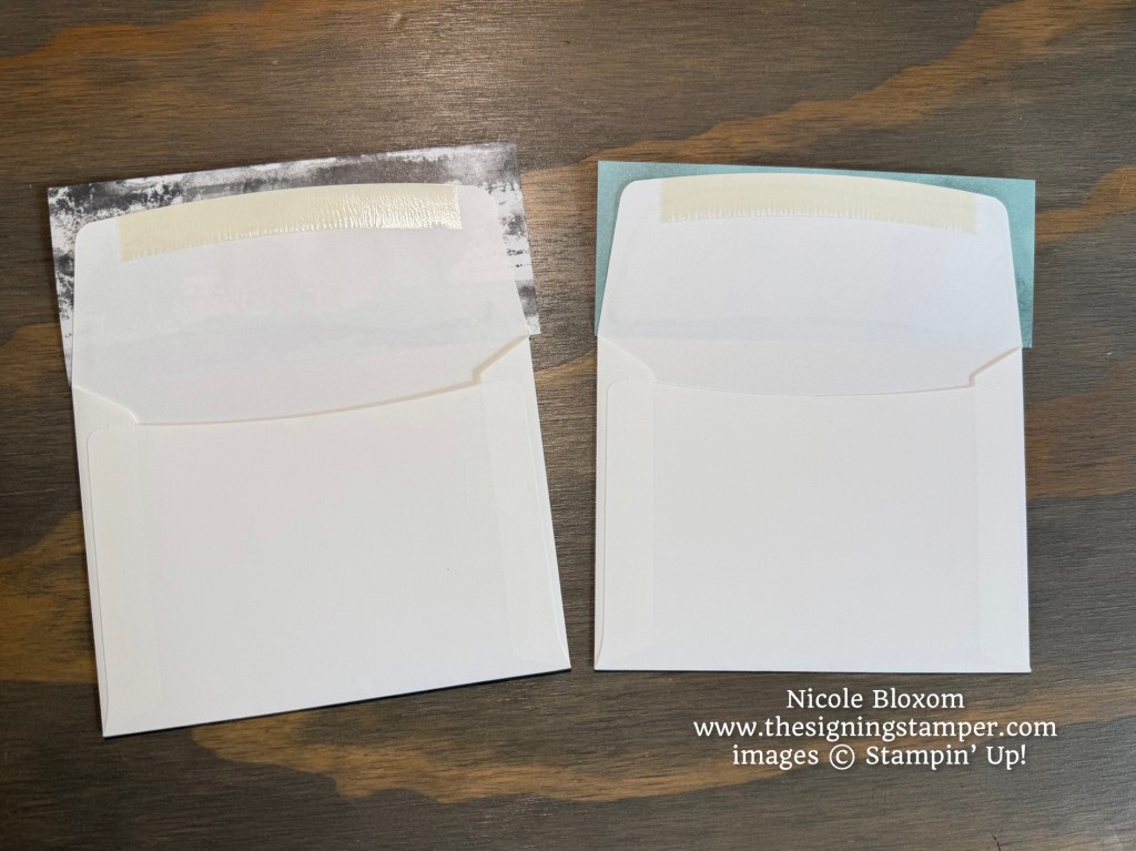 To make these cards feel even more personalized, I decided to dress up the envelopes with the DSP as well. To make those, glue a 6″ x 2-1/2″ panel on the flap and then trim the overhang.