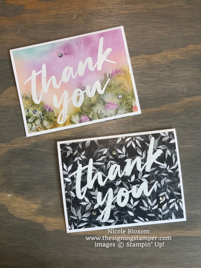 Are you like me where you are always in need of a Thank You card? I like to give people a handwritten note to let them know I appreciate their thoughtfulness. I usually want to make elaborate cards to show them just HOW much I appreciate them! However, I’ve found that tends to make me procrastinate when I have to find that extra time to make a elaborate card. With Stampin Up’s beautiful Designer Series papers, I can still get that same effect in significantly less time! Let these paper do the work for you!! Here are two Thank you cards that I made using Designer Series Paper, Thanking You Stamp Set, and heat embossing!