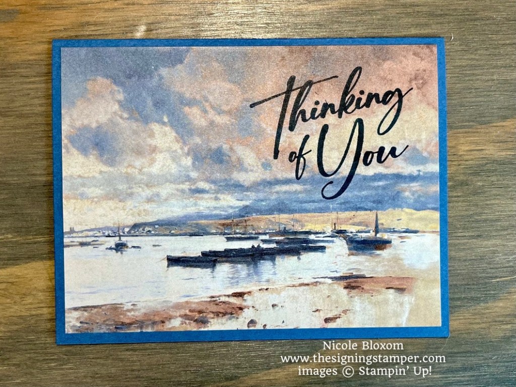 Here’s another Thinking of You card I made with this stamp set and these techniques. It is heat embossed with Night of Navy. Because this one was for a male recipient, I skipped the thread embellishment. The cardbase for this card is Misty Moonlight. The DSP is Beautiful Gallery DSP which has so many beautiful focal images ranging from countryside scenes to water scenes to flowers.