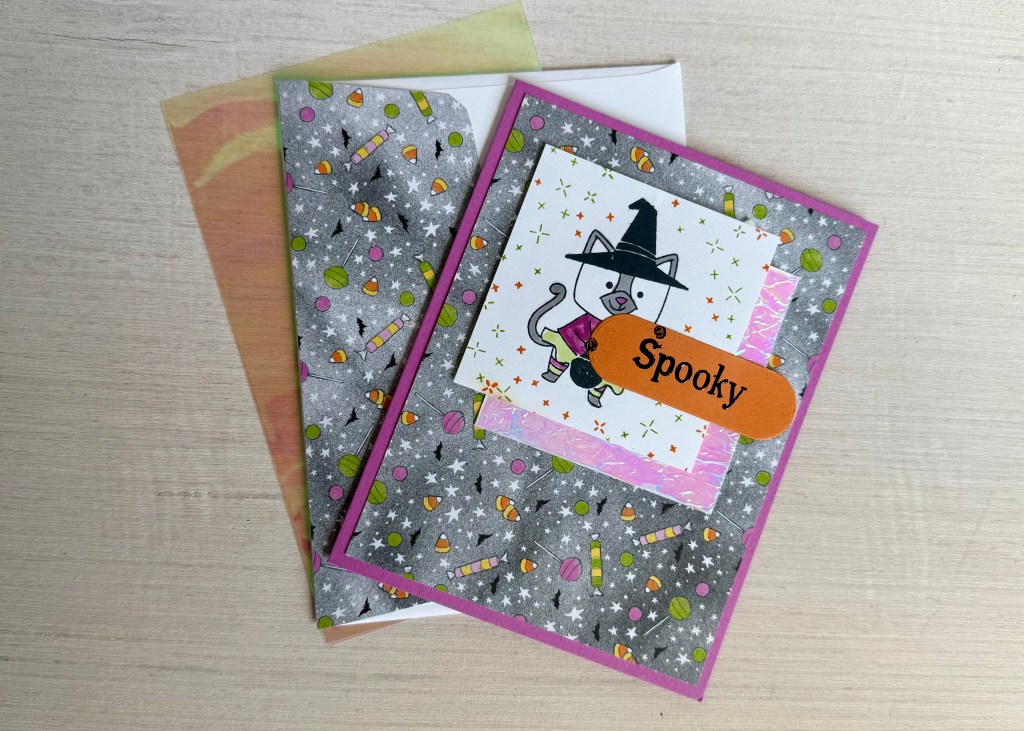 For the top square, I cut another Basic White square in the same size, 2-3/4″ x 2-3/4″. I stamped the cat image from the Spooky Halloween Stamp Set in Memento Tuxedo Black. I colored the image with my Stampin Blends in Smoky Slate, Petunia Pop, and Granny Apple Green. I stamped some extra “bling” around the cat in Granny Apple Green and Pumpkin Pie.