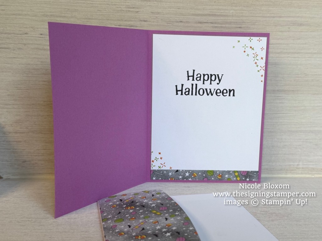 For the inside of the card, I adhered a small strip of the DSP on the bottom of a Basic White panel (4 x 5-1/4″) . The white panel was also stamped with some more of the “bling” images in Granny Apple Green and Pumpkin Pie. The sentiment “Happy Halloween” was stamped with Memento Black Tuxedo.