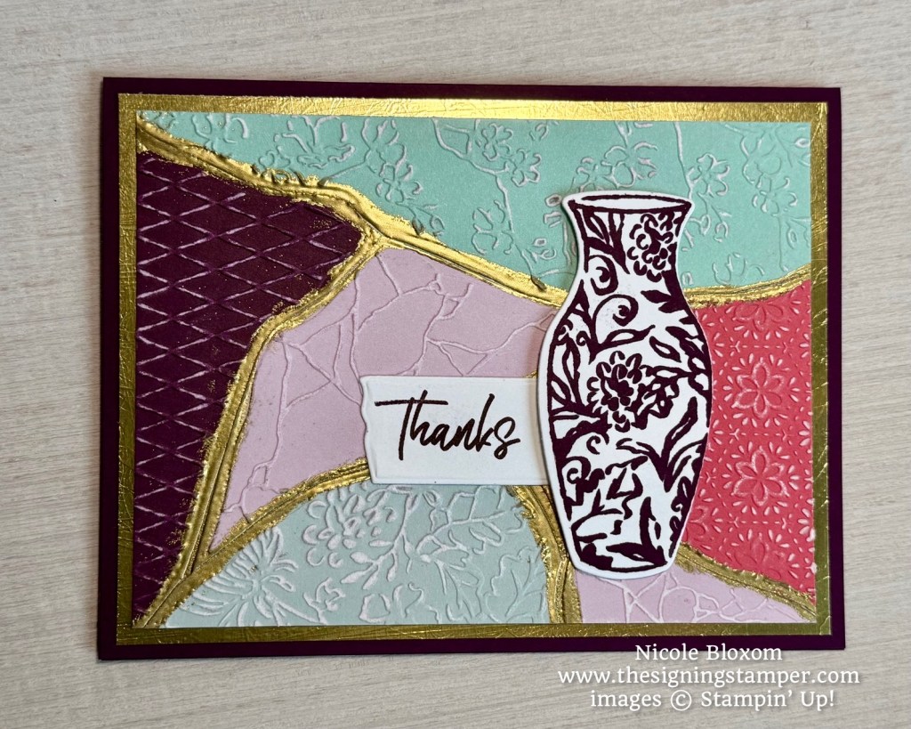 To make this card I used the Celebrate Together Two Tone Cardstock pack. This one has 5 different colors in the packet: Blackberry Bliss, Cloud Cover, Daffodil Delight, Fresh Freesia, Pool Party, and Strawberry Slush. I used each color, one at a time in the embossing folder, lined up exactly the same each time. Then I gathered them together and cut along all the “cracks”. Next, I pieced the sections back together using a different color for each section. I glued it together on a panel of Basic White. I used a sanding block to gently sand the raised embossed areas of the two tone cardstocks. You can see the white areas where it has been sanded. I trimmed it all down to 5-1/8 x 3-3/4″. I applied little bit of Versamark refill onto the “cracks” and applied gold embossing powder and heat embossed it. My intention was to make it look like the gold lacquer in the Japanese pottery. I layered that onto a Gold Foil panel cut at 5-1/4 x 4″. The cardbase is Blackberry Bliss.