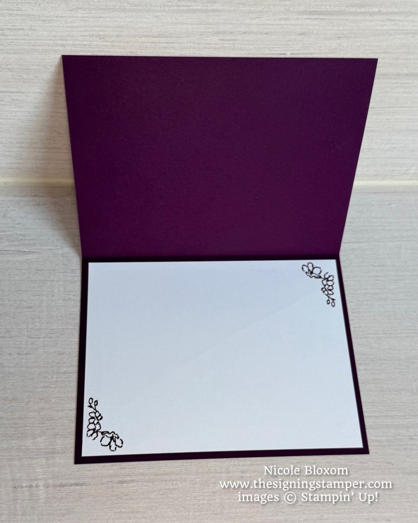 For the inside of the card, I stamped small flowers on the corners of a Basic White panel with Blackberry Bliss ink.