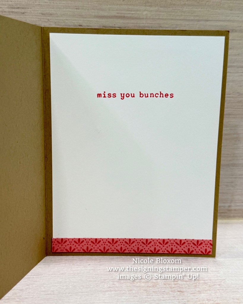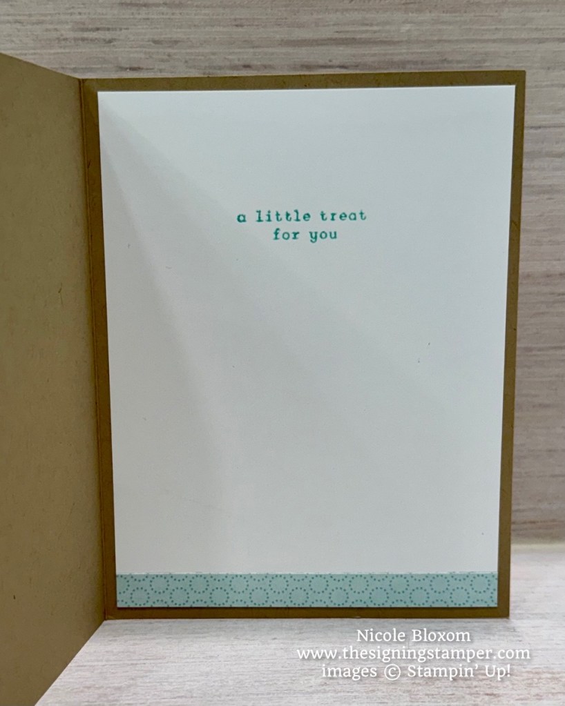 For the inside of the card, sentiments were used to correspond with the front. For example, for the cookie jar card, the inside sentiment is “A little treat for you” and for the jar of hearts card, the inside sentiment is “miss you bunches”.