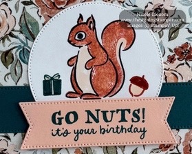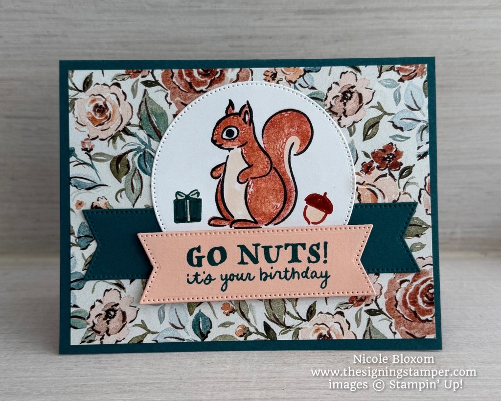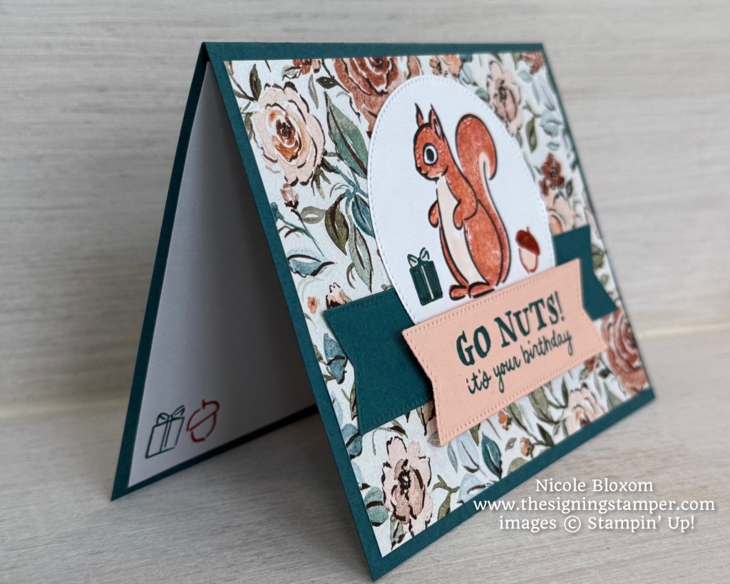 To make this card, I used Pretty Peacock for the cardbase, cut at 8-1/2 x 5-1/2″ scored at 4-1/4″. The floral paper is from the Floral Charm Designer Series Paper, cut at 4 x 5-1/4″. The squirrel is stamped on Basic White cardstock in Memento Tuxedo Black. I inked the “filler” stamp in Cajun Craze and stamped off twice to lighten the ink and then stamped inside the squirrel. Next, I took my Petal Pink Stampin Blend and colored the white parts of the squirrel. The gift box was stamped with Pretty Peacock ink and the acorn was stamped with Cajun Craze ink. I used the 2nd largest circle die from the Stylish Shapes dies to cut out the stamped images.
