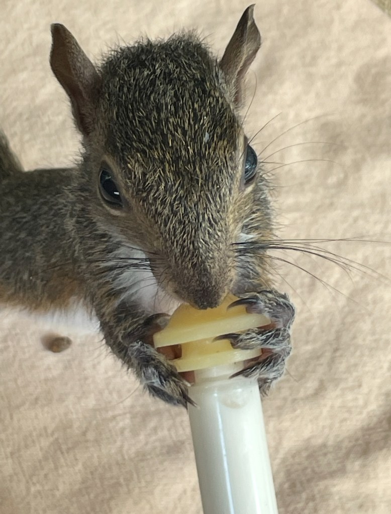 It was so much fun making this card, I decided to make another one. This time I used a floral theme for my friend’s birthday. My friend is one of those special people that has a big heart for animals. She runs a non-profit animal rescue. She also helped our local wildlife rehab organization with taking care squirrels and possums. Here is a picture of me feeding one of the squirrels she rescued!
