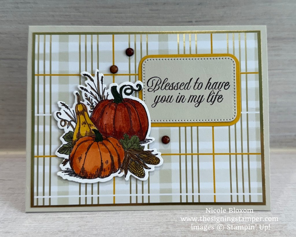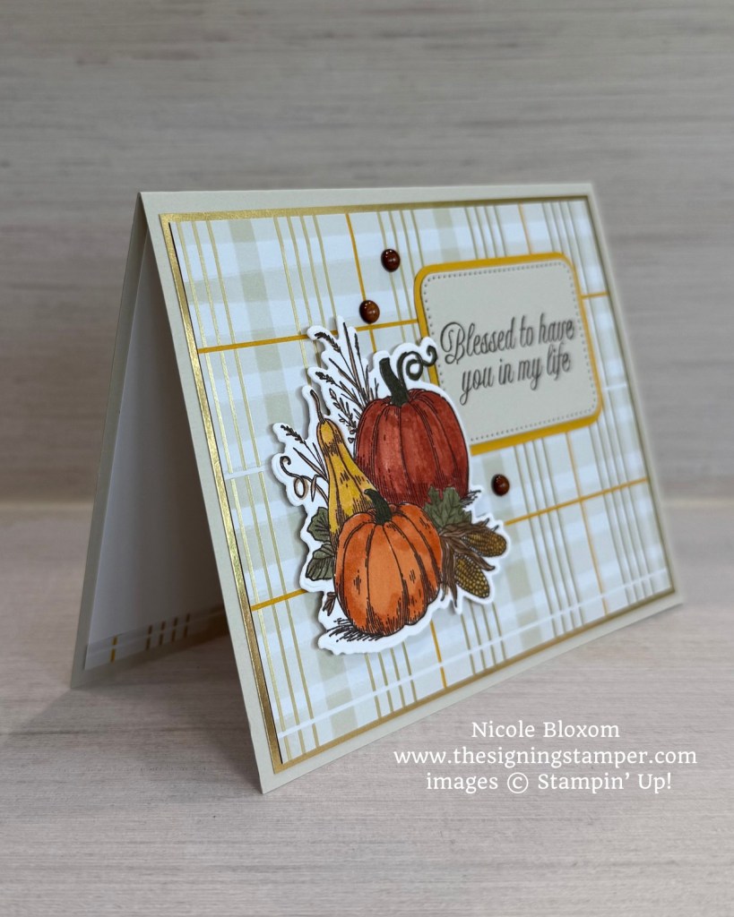 Hope you are having a good weekend! This weekend I am visiting my family in Dallas. This card is good timing as it reminds me I am blessed to have these family members in my life. I have already made a few cards with this Amber Autumn stamp set. I had not used this specific stamp image yet, so I pulled it out again. I knew I wanted to contrast the colorful image with a simple background. When I browsed through the Gathering Together Designer Series Paper, this one jumped out at me. From there, the rest of the card came together in my head.
