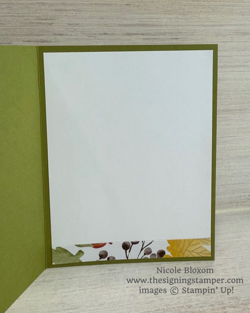 For the inside of the card, I kept it simple by adding a small strip of the same DSP onto a Basic White panel. Later, I can decide which sentiment I want to add, or leave it blank for more space for a handwritten message.
