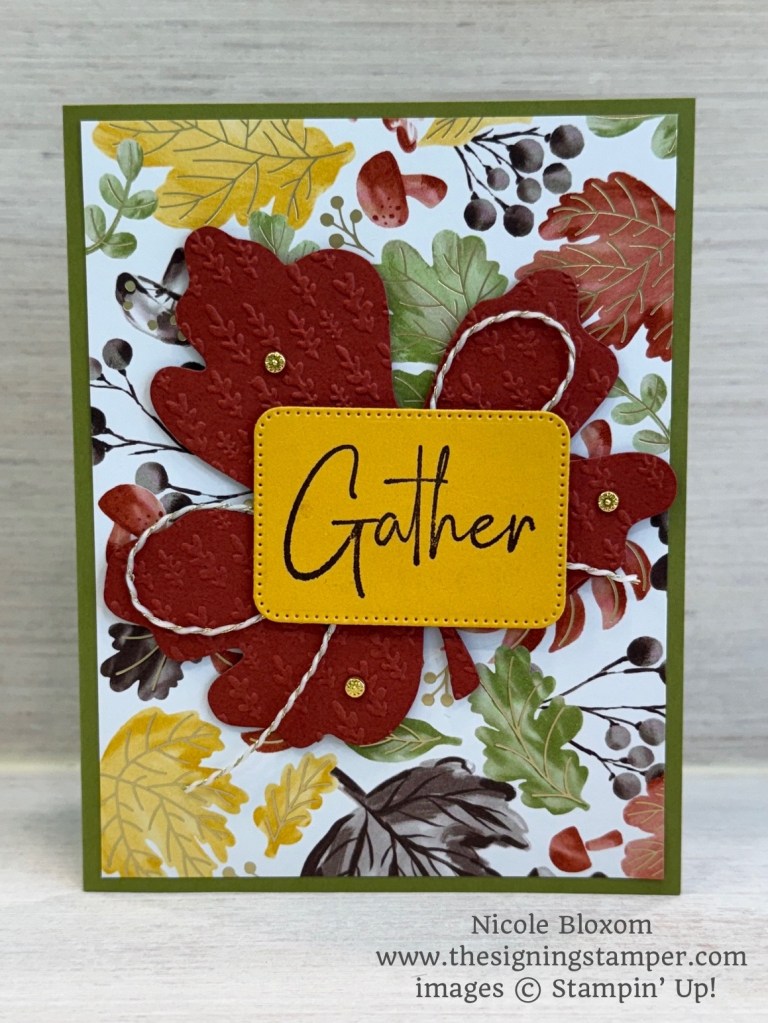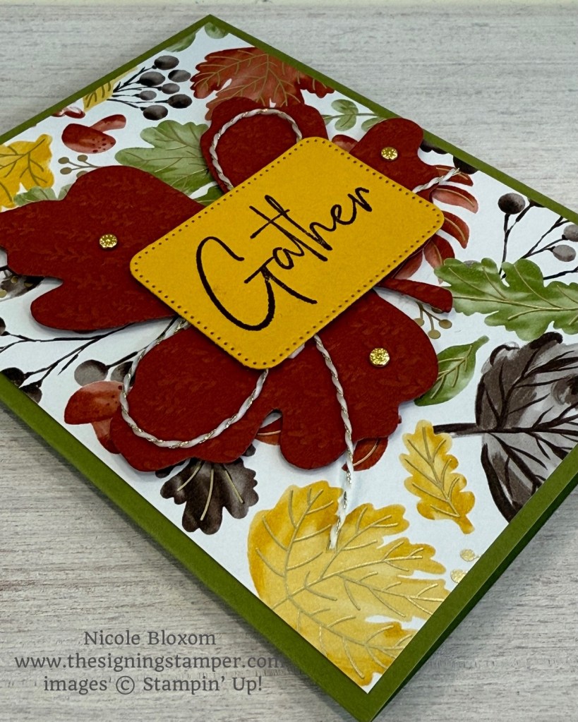 The cardbase is Old Olive cardstock cut at 8-1/2 x 5-1/2″ & scored at 4-1/4″. The next panel is the gorgeous colorful pattern of Gathering Together DSP that I love so much. I love the light touch of gold in the paper. The leaf is Cajun Craze cardstock cut with the Gathering Moments Die, and then embossed with the Gathering Leaves Embossing Folder. I adhered the leaf with dimensionals. Then I stamped the sentiment “Gather” in Early Espresso ink onto Crushed Curry cardstock. The sentiment is from the Gathering Moments stamp set. This was cut out with a die from the Nested Essentials Dies. Before I adhered the sentiment label, I added a bow made with the White & Gold Baker’s Twine from the Modern Christmas Suite. I added the Crushed Curry sentiment over the bow with dimensionals. The last step was to add gold Flower Accents Embellishments to bring out some more of the gold in the paper.