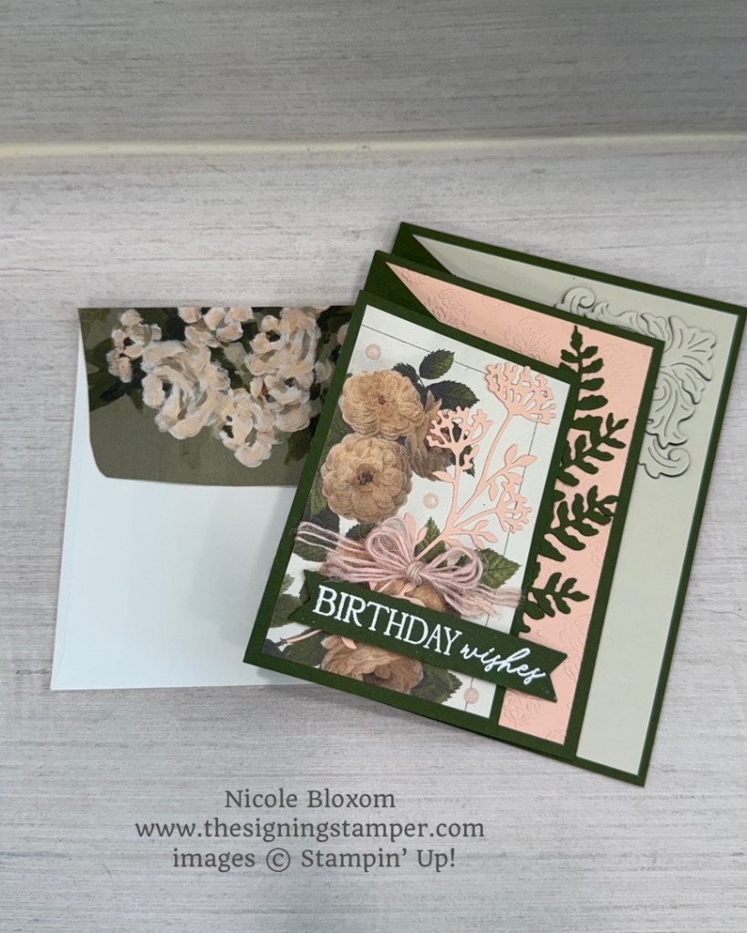 I used Gallery Blooms Designer Series paper as my daughter loves flowers and her favorite colors are green and pink/peach. This card uses Mossy Meadow, Petal Pink, and Basic Beige for the colors.