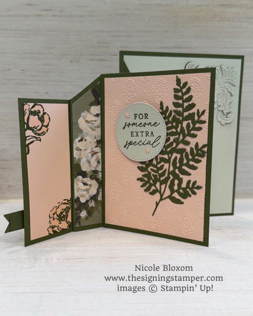 The card opens like a book. When you open the first page, the picture above is what you see. On the Petal Pink panel you see on the left side, I stamped part of the flower image from the Gallery Blooms stamp set with Mossy Meadow ink. I colored it in with Petal Pink Stampin’ Blends. The middle panel is a pattern from the Gallery Blooms DSP. I also colored the flowers on this DSP with my Petal Pink Stampin’ Blend. The Petal Pink panel on the right side is embossed with the Damask Design Embossing Folder. I cut out the Mossy Meadow leaves with a die from the Beautiful Motifs Dies. I glued that leaf cut on. The sentiment “For someone extra special” is also from 12 Days of Crafting Advent Calendar stamp set. It was inked in Mossy Meadow and stamped onto Basic Beige. It was cut out with die from Stylish Shapes and adhered with dimensionals. I added 2 petal pink Charming Shimmer Faceted Dots to the sentiment circle.