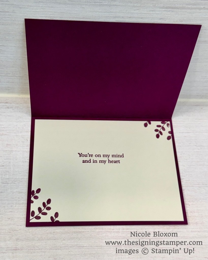 For the inside, I stamped a Basic Beige panel with the sentiment ” You’re on my mind and in my heart” in Blackberry Bliss Ink. I also added the small leaf stamp in two of the corners. These sentiments are simple but meaningful and can be used in a variety of situations.