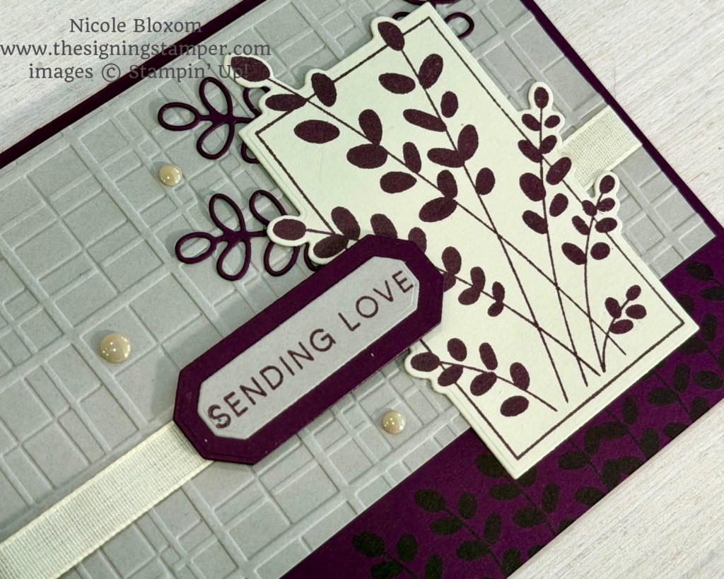 To make this card, I cut Blackberry Bliss cardstock for the cardbase at 8-1/2 x 5-1/2″ and scored it a 4-1/4″. I stamped the very bottom of the front of the card repeatedly with the small leaf image from the Friendly Foliage stamp set in Blackberry Bliss ink. It’s hard to see in the picture but it actually looks nice in person. I cut a panel of Gray Granite at 5-3/8 x 3-1/4″ and embossed it with the Forever Plaid Embossing Folder. I wrapped a strand of Basic Beige Ribbon around this panel before gluing it on. Next I stamped the rectangle & leaves image from the Friendly Foliage stamp set. I die cut that with the corresponding die cut and glued it on. Before I pressed down on the glue completely, I cut out three Blackberry Bliss leaves with the small leaf die and tucked them behind the rectangle with a small touch of glue. I stamped the sentiment “Sending Love” from this same stamp set in Blackberry Bliss ink on scrap Gray Granite cardstock. I cut it out with the smaller word die from Words of Beauty Dies and cut out the next larger word die with Blackberry Bliss cardstock. I matted these together and then adhered them with dimensionals. The last step was to add 3 Basic Beige Pearls of Beauty embellishments.