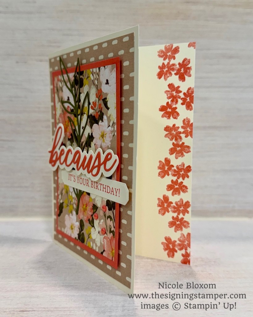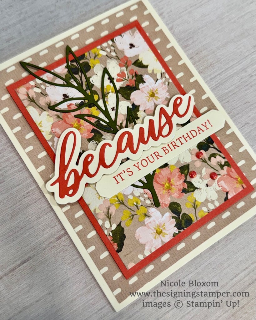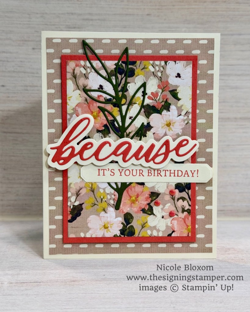 The cardbase is Very Vanilla cardstock, cut at 5-1/2 x 8-1/2″, & scored at 4-1/4″. The next panel is from Brushed with Beauty Designer Series Paper, cut at 4 x 5-1/4″. This was glued on. The next panel is Calypso Coral cardstock, cut at 3-1/4 x 4-1/2″. On top of the Calypso Coral is a floral pattern from the Brushed Beauty DSP that is cut at 3 x 4-1/4″. I glued the floral pattern on. The Calypso Coral and floral DSP glued panel are then adhered with dimensionals. I used the long thin leaf die from the Petals of Beauty Dies to cut scrap Mossy Meadow cardstock and glued this leaf on. Next I used the Words of Beauty dies to cut the 2 layers of “because” with scraps of Very Vanilla and Calypso Coral cardstock. These were glued together and then adhered to the card with dimensionals. I stamped the sentiment “its your birthday” from the Words of Beauty stamp set in Calypso Coral ink onto scrap Very Vanilla cardstock. I cut this out with the sentiment die from Words of Beauty Dies and glued it on just underneath the “because”. The final touch was to add 3 Calypso Coral colored Pearls of Beauty Embellishments.