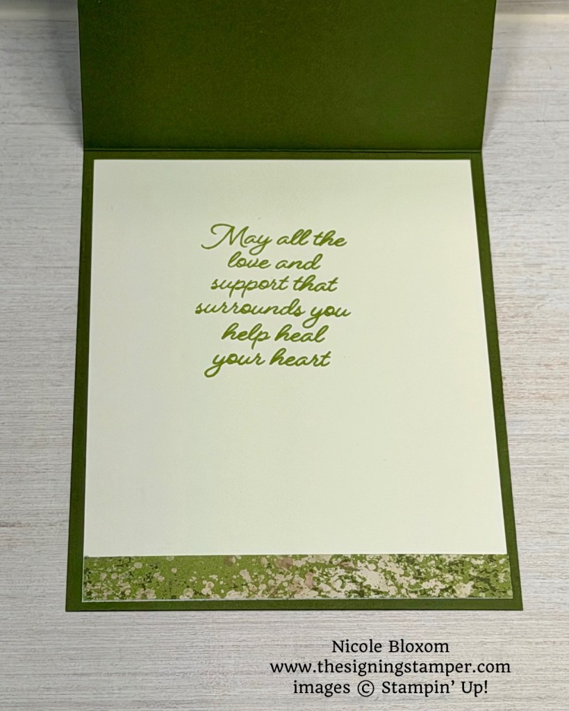For the inside of the card, I added a small strip of the same DSP at the bottom of a panel of Very Vanilla cardstock. I stamped another sentiment from the Framed All Around stamp set that will be coming out in March. It was inked in Old Olive ink.