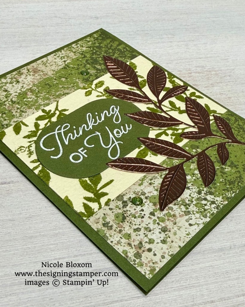 • Stamp large leaf image from Nature’s Symphony stamp set onto the Textured Paper several times with Old Olive Ink