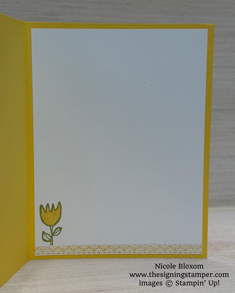 For the inside, I decorated a basic white panel by stamping the tulip image from Easter Basket stamp set in Old Olive ink and coloring it in with Daffodil Delight. I also added a small strip of the same Mixed Up Patterns DSP at the bottom.