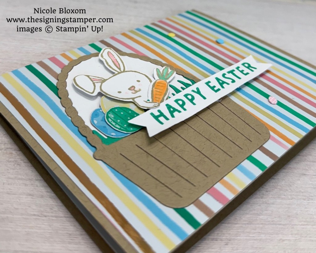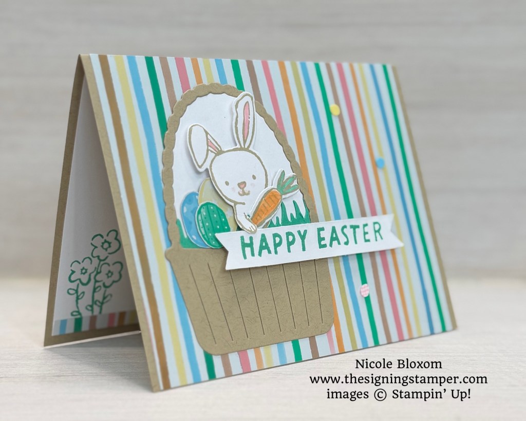The Easter Joy Specialty Designer Series Paper is so fun with its bright cheerful colors. I especially love the foil accents to the pages. The Easter Basket bundle is a great one, you can use it for Easter cards or for general flowers in a basket card, like the one I made in my previous blog post. I hope you enjoyed this card. If you have any questions about this card or any of your stamping needs, please reach out to me at nicole@thesigningstamper.com, I would be thrilled to help you🤟