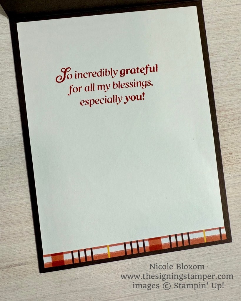 For the inside of the card, I decorate a Basic White panel with a small strip of the plaid patterned Gathering Together DSP. The sentiment is inked in Cajun Craze and is from the Words For The Season stamp set.