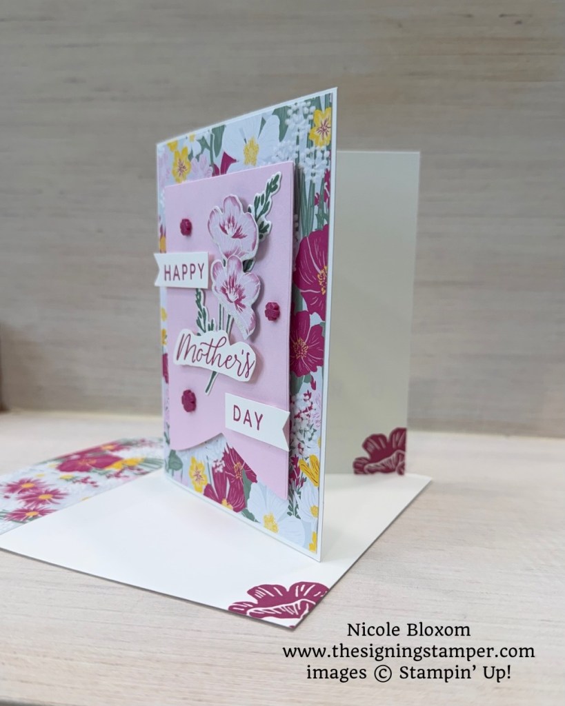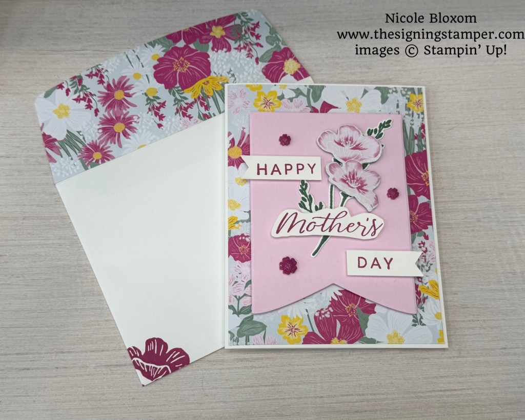 To complete the coordination, I added the same DSP to back of the envelope and stamped one of the flower images from the Flowering Meadow stamp set onto the envelope and the inside of the card.