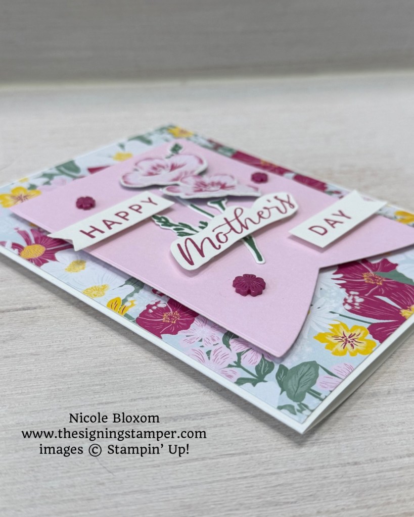 Happy Spring! I hope everyone is doing good and ready to see our creations for this month’s team blog hop! Our theme this month is “For the Girls/Ladies”. This is the perfect time for me to get started on Mother’s Day cards. I also just received all my pre-order goodies from the May- August 2026 catalog and May Online Exclusives. This such a great perk of being a Stampin’ Up demonstrator. We can order ahead of time! One of my favorite new suites in the catalog is the Velvet Meadow Suite which has beautiful pink and green florals. The green color in this suite is the new Peaceful Pine In Color. I also wanted to highlight how you can use the catalog for inspiration in designing your cards. I knew I wanted to use this suite and make a Mother’s Day card but beyond that, I was not sure what I wanted to create. So I pulled out the catalog and browsed the sample products featured and immediately found a card I wanted to CASE (copy and share everything). I am casing the card on page 33. I’m using the same general layout but changing the sentiments and some of the accents. The catalog is such a GREAT source of inspiration! Here is my card: